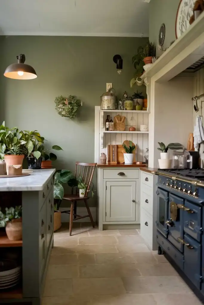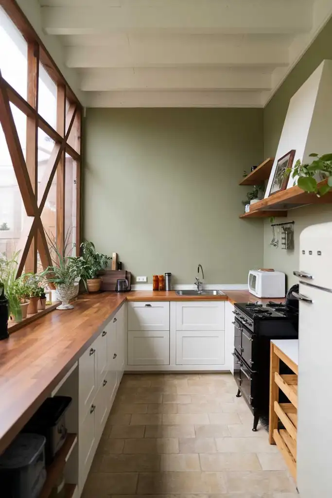 For a soft, serene look, paint your kitchen walls in sage green. It pairs beautifully with white trim and warm wood tones. If you want to experiment, add a feature wall painted in a darker shade of sage to create contrast.