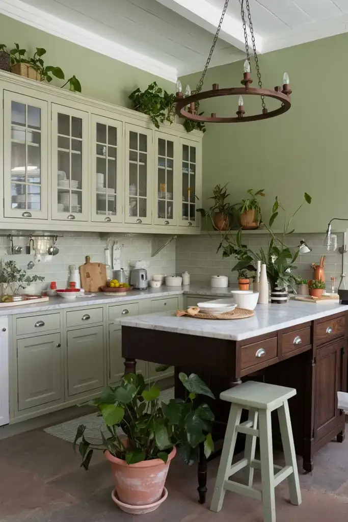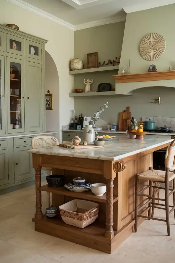 Adding a sage green kitchen island can be an excellent way to introduce color without overwhelming the space. This design works well with neutral-toned cabinets and countertops, bringing a splash of color to the heart of your kitchen.