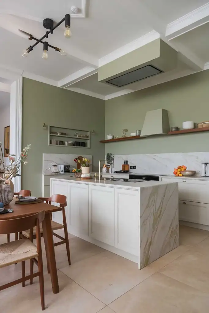 Sage green pairs beautifully with the luxurious look of marble countertops. This timeless combo blends modern and classic elements, creating a chic, elegant space that exudes sophistication.