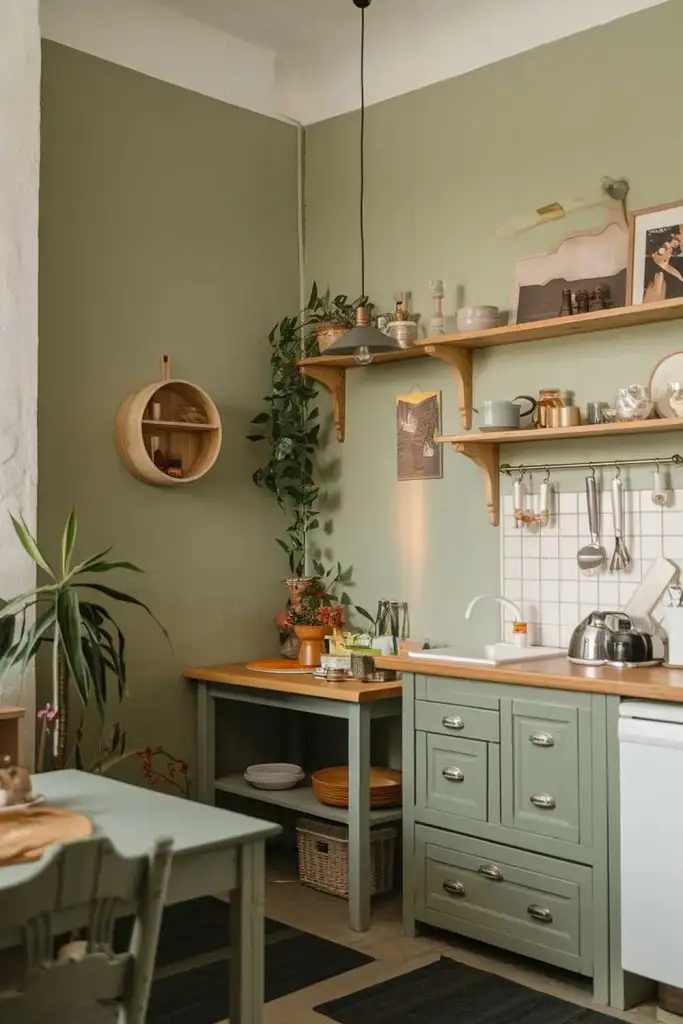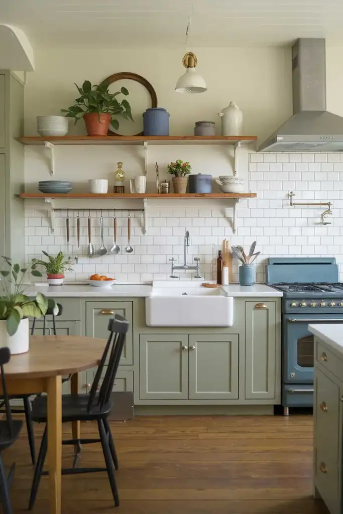 8. Open Shelving with Sage Green