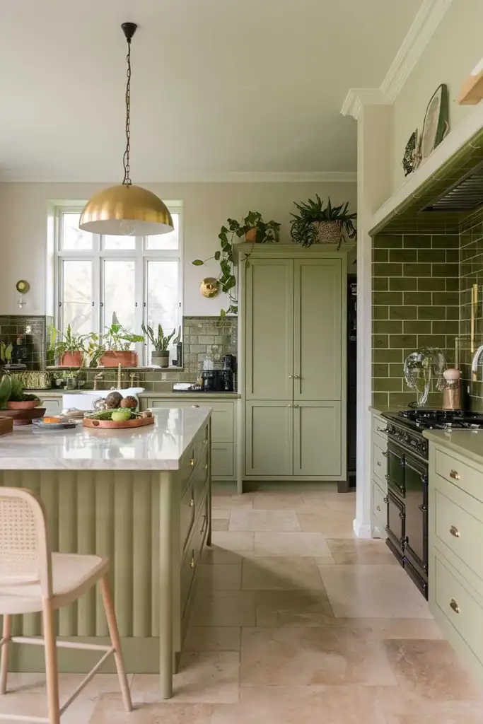 Tiles in sage green, whether on the floor or as part of your backsplash, create a sophisticated yet calming effect. Consider large-format tiles for a modern feel or classic subway tiles for a traditional touch.