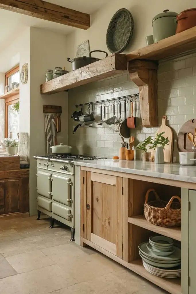 Sage green looks stunning when paired with natural wood elements, such as oak or walnut. This combination gives your kitchen a rustic, organic vibe and creates a warm, welcoming atmosphere.